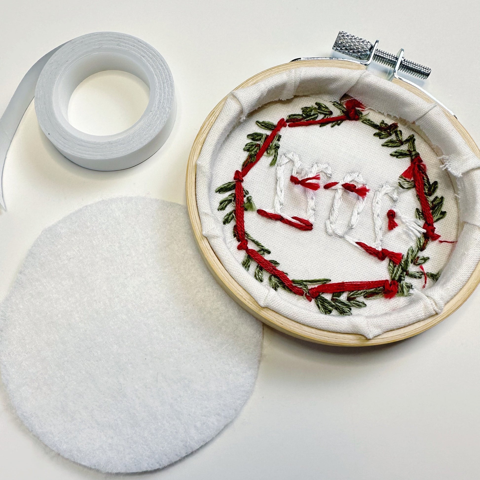 No need for glue or sewing on felt! Ince you’ve laid your felt circle inside the back of the hoop, simply apply to the inside of the inner hoop, remove paper backing and press fabric to inner hoop! And done!