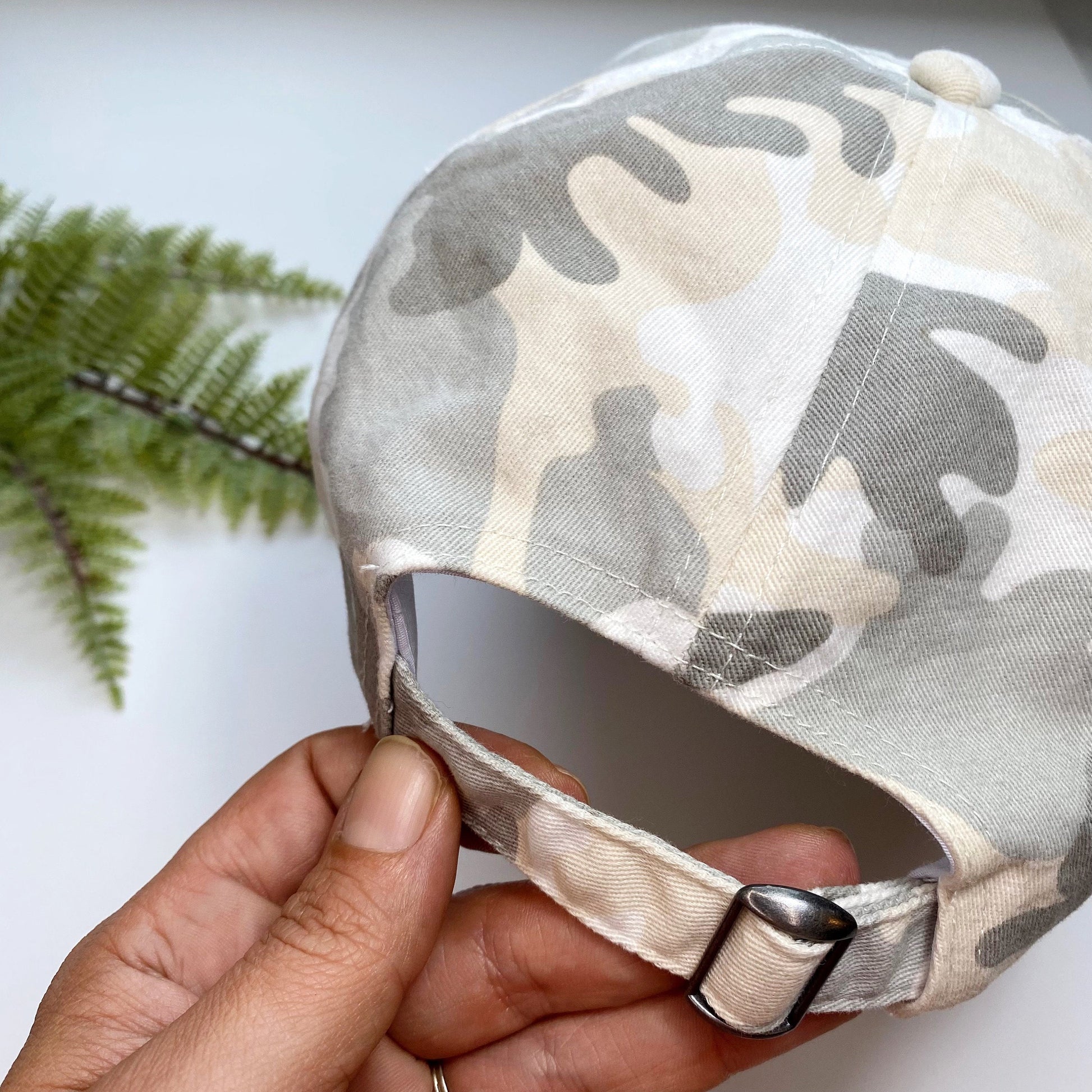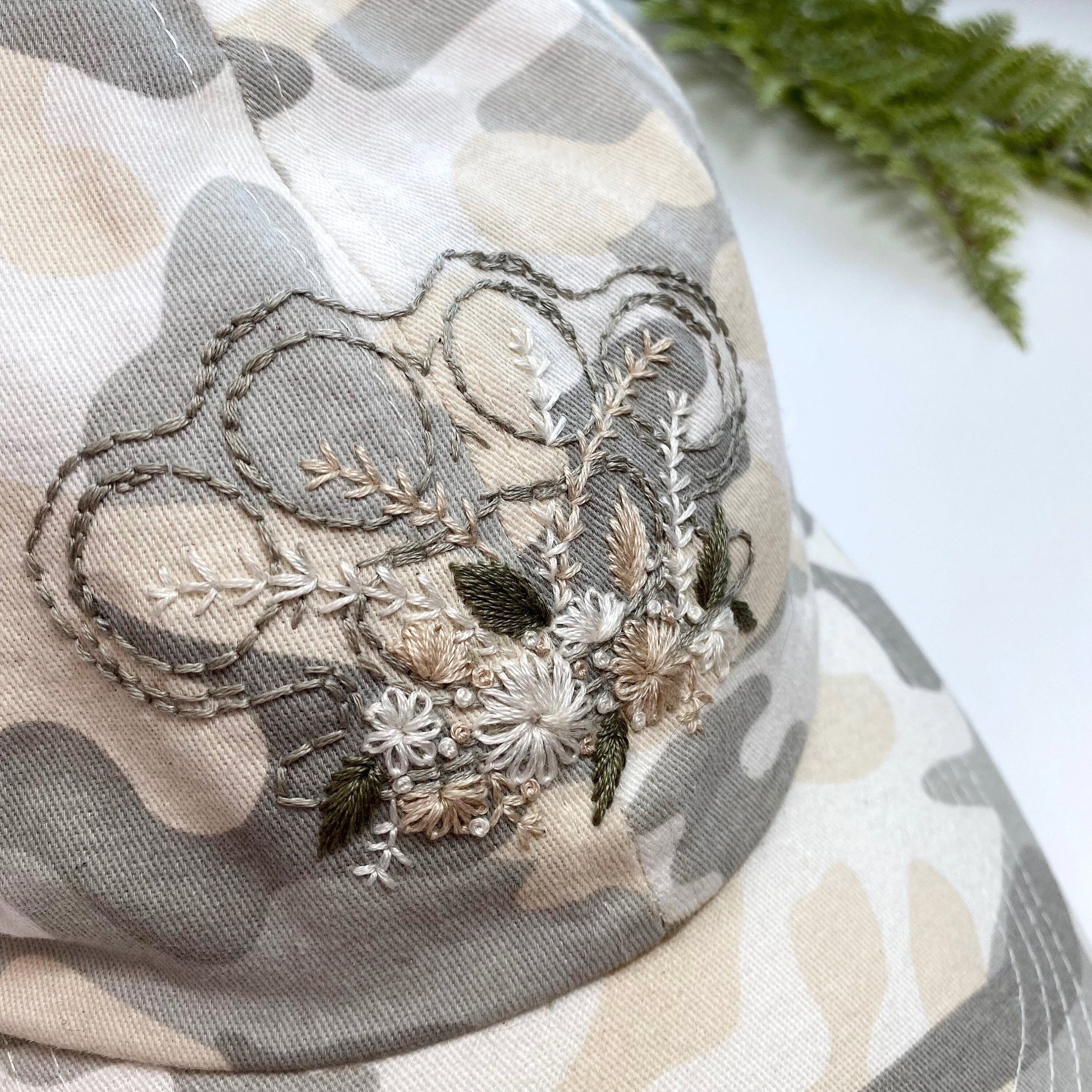 Hand embroidered brass knuckles and flowers on adult size, adjustable peach, gray, and white camo baseball cap.