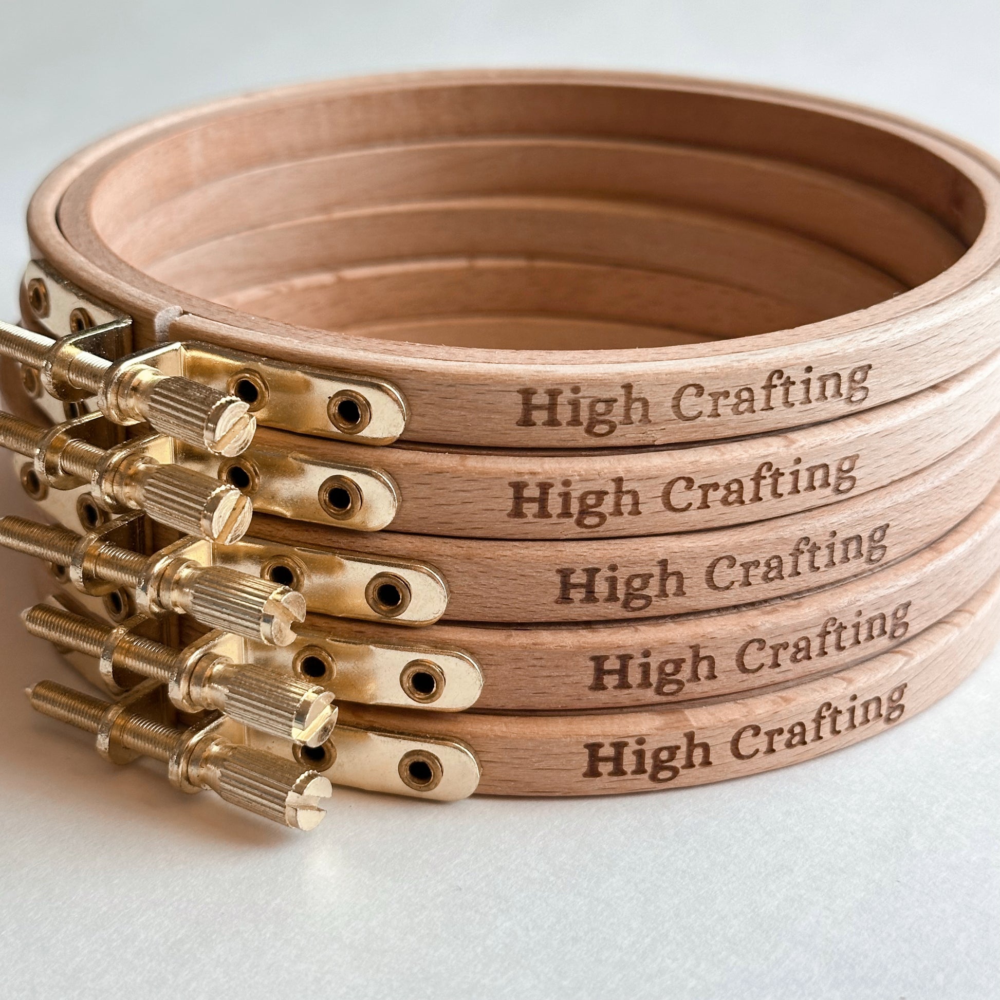 These are the same high quality beechwood embroidery hoops included in our kits, each one branded with the High Crafting logo.