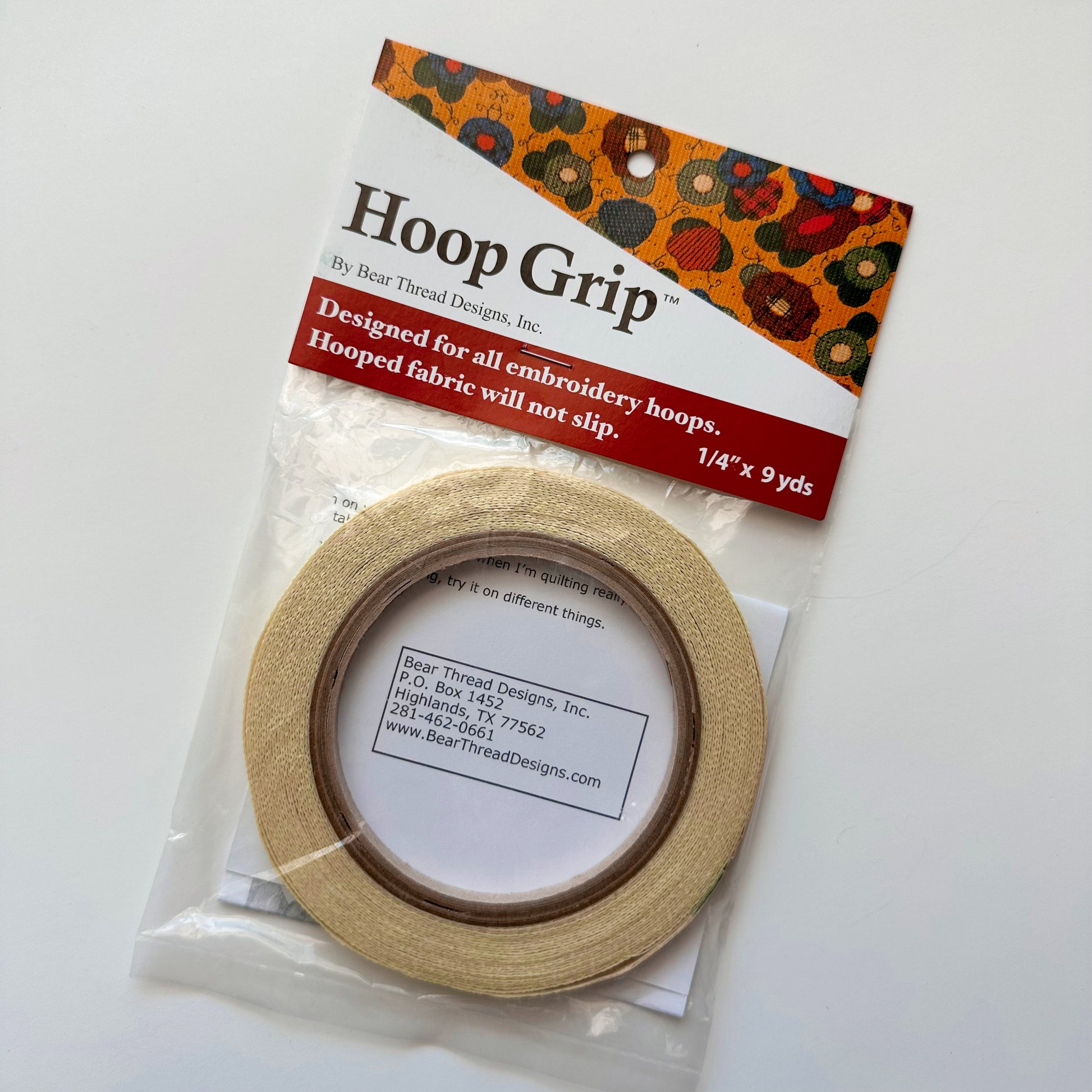 - Sticky side of the tape is placed against the outside of the smaller embroidery hoop; the other side of the tape has a rubberized finish and creates just the right amount of grip for even slippery fabrics.