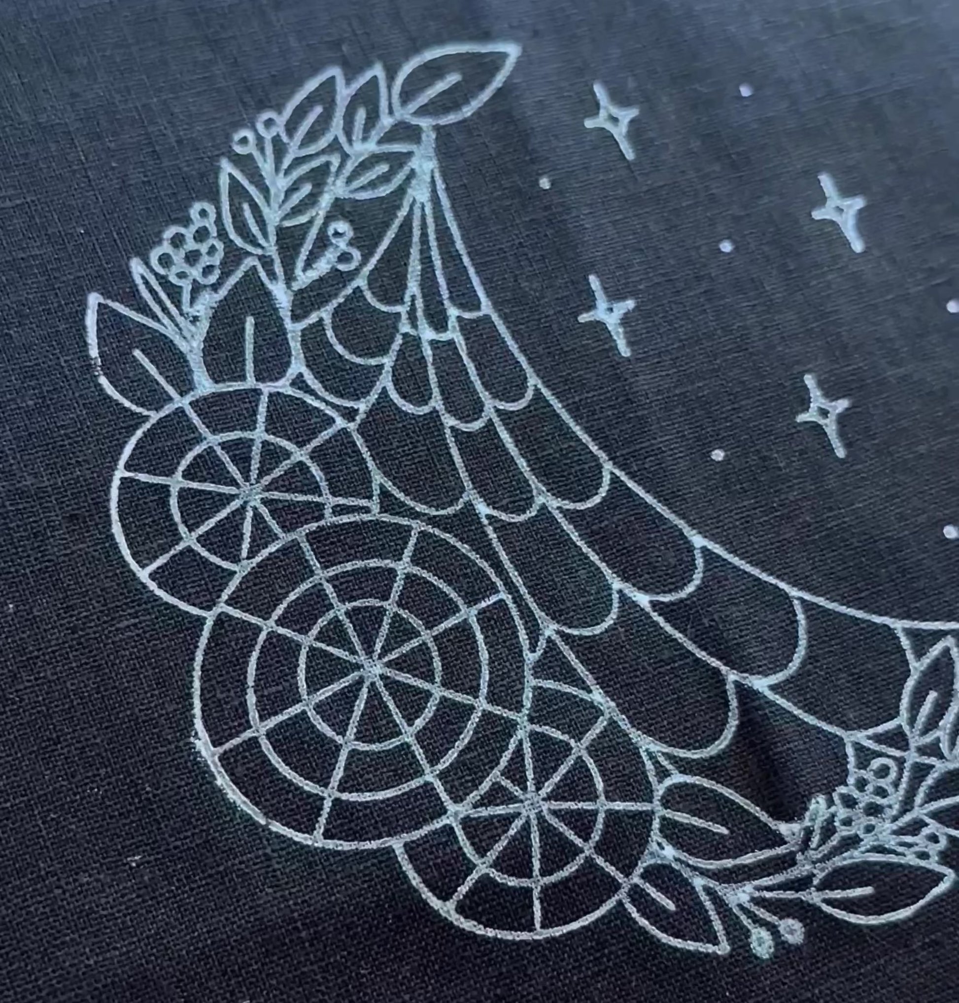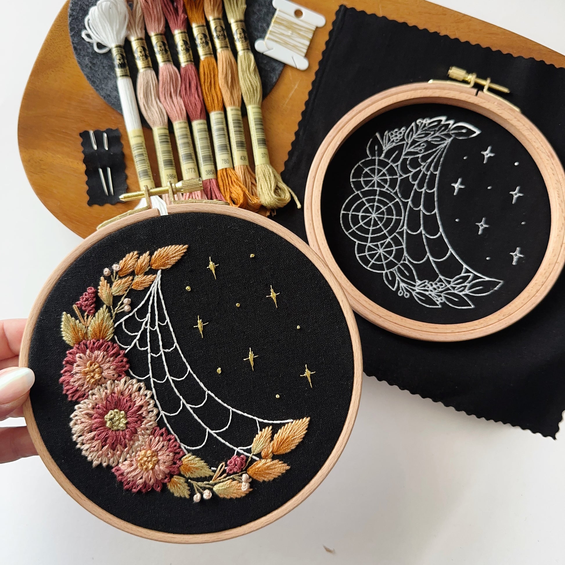 Get in the mood for spooky season with some moody embroidery! You're going to love this kit! I mean, how many kits do you see on black fabric with the pattern pre-stamped in white heat erasable ink? AND it features not one, but 2 specialty fibers for extra pizzaz! The web 🕸 glows in the dark and the stars are shiny gold ✨